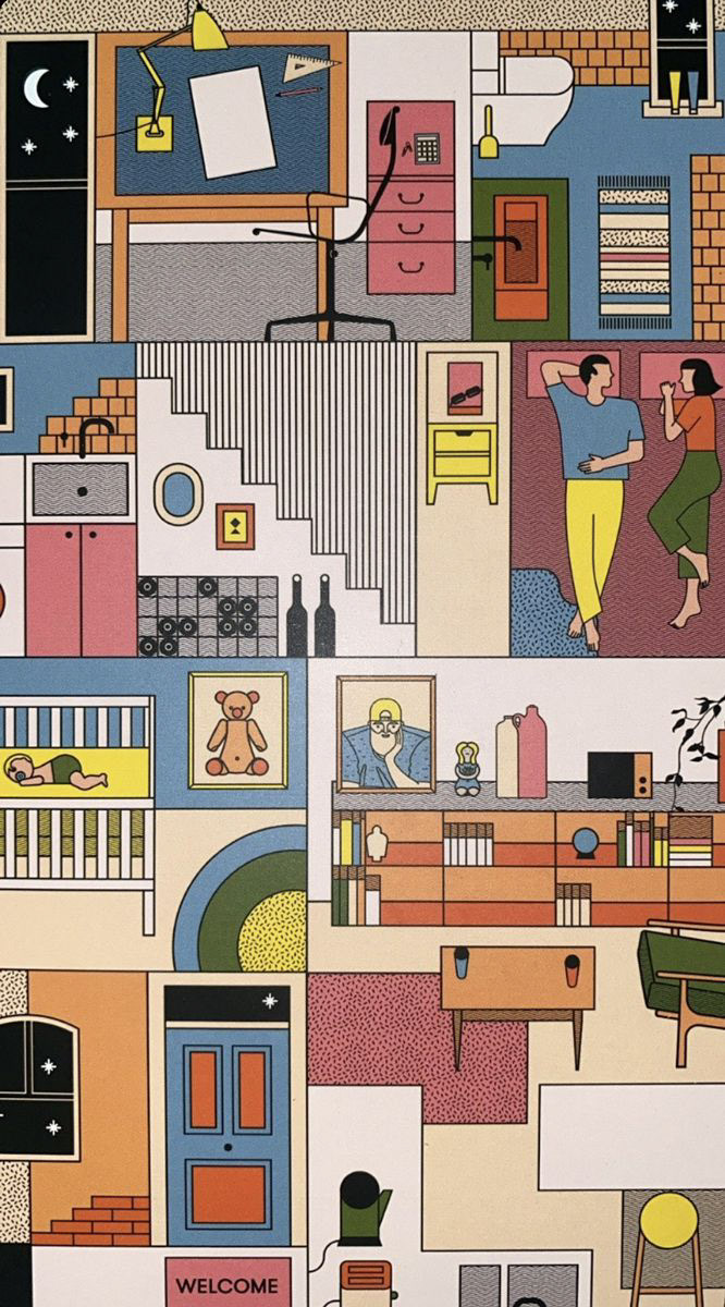 Okay. now that I've been drawing my own apartment for a hot second now I need to stylize it. I looked at these mostly to figure out what my perspective was going to be like, but now that I have to start thinking about color schemes I'm going to draw inspo from these. What I like about the middle two is the limited palette, because it looks a little more like a wall piece. My issue is that it becomes a little bit flat in character and personality. So I think I may have to bring in some detail in line to make up for it.