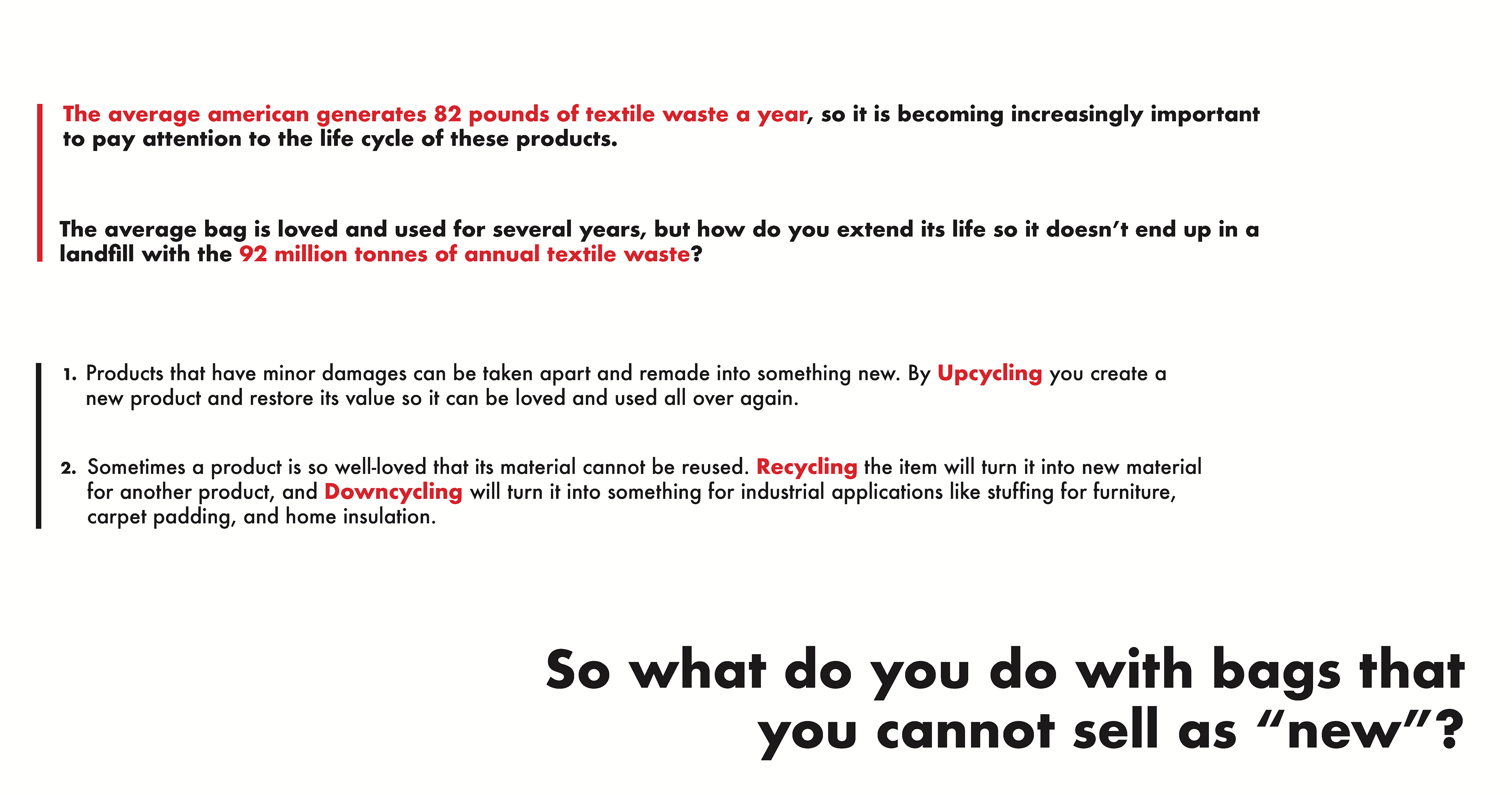 Working as an intern for summer 2021, I worked with CEO Jan Lo to tackle sustainability at Lo & Sons. Starting with deep market research and an introspective analysis of efforts within the company, we found that deadstock could be a great opportunity. Below is a summary of my time at Lo & Sons.